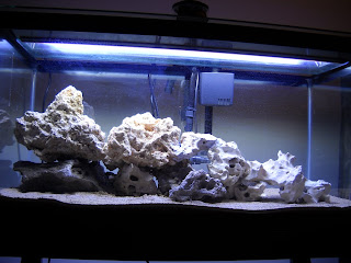 I've been wanting to start a saltwater reef tank for a while now, probably since I set up my first few freshwater tanks and had success keeping fish. However, the high cost of the equipment and a lack of confidence had always kept me from taking the plunge into saltwater. Now, after learning from coworkers and customers alike, as well as helpful forums like http://www.fishlore.com/ and http://www.3reef.com/, I have set up my first tank! Here's a look a my specs: